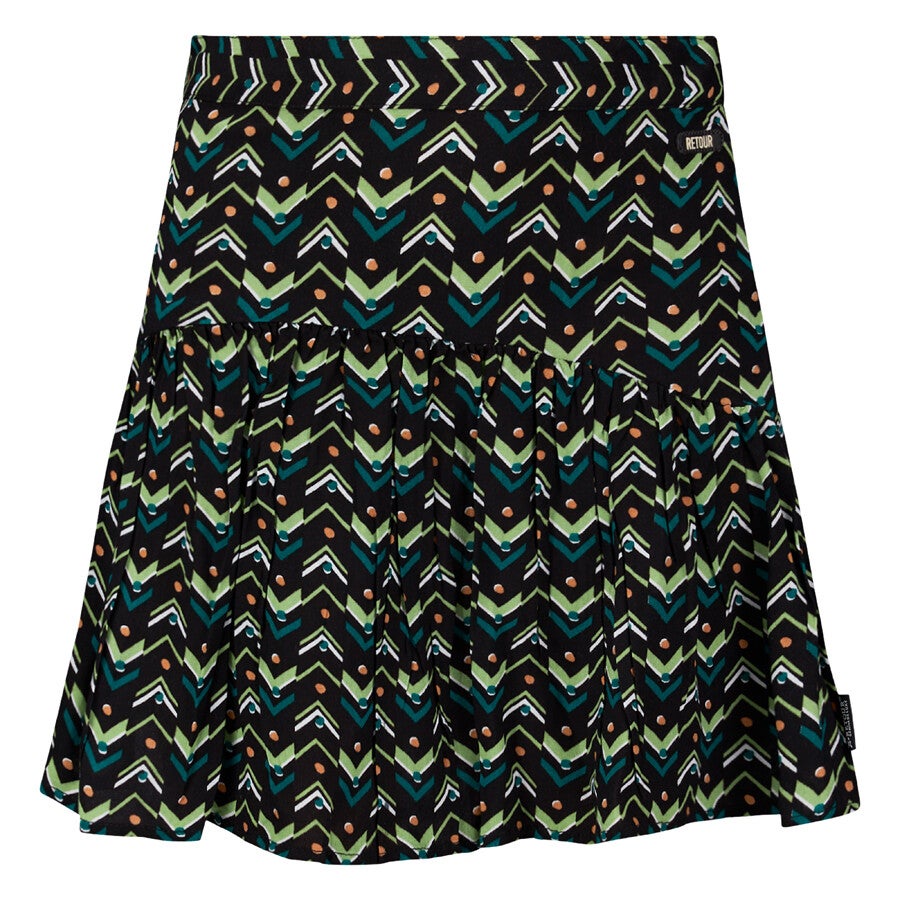 Een korte, uitlopende rok uit de wintercollectie van Retour Jeans met brede volant onderaan. De rok heeft een ritssluiting aan de zijkant.